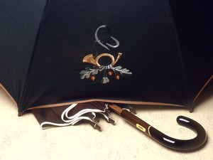 Exclusiver Regenschirm mit zweifarbig lackiertem Holzgriff und echter Motiv-Stickerei JAGDHORN. (Andere Motive finden Sie in der Produkt-Gruppe "Exclusive Regenschirme mit Hobby-Motivstickereien")