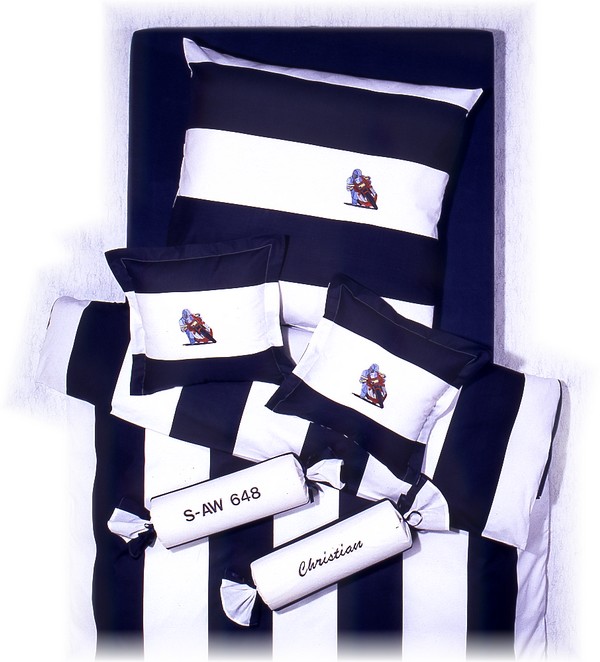 Bestehend aus Bettbezug 135x200 und Kissenbezug 80x80 im gemusterten Originalstoff sowie Stickerei auf großem Kissen (ohne Zierkissen und Nackenrolle)