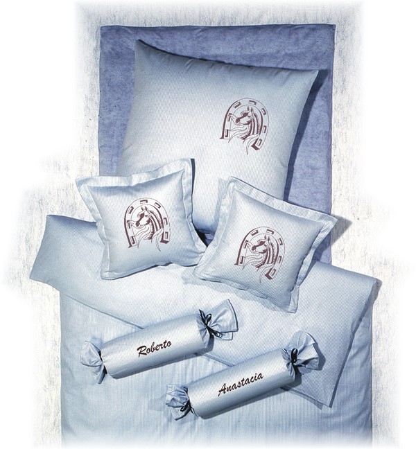 Bestehend aus Bettbezug 135x200 und Kissenbezug 80x80 im Originalstoff, incl. Stickerei "Pferdekopf/Hufeisen" auf großem Kissen ( ohne Zierkissen und Nackenrollen)