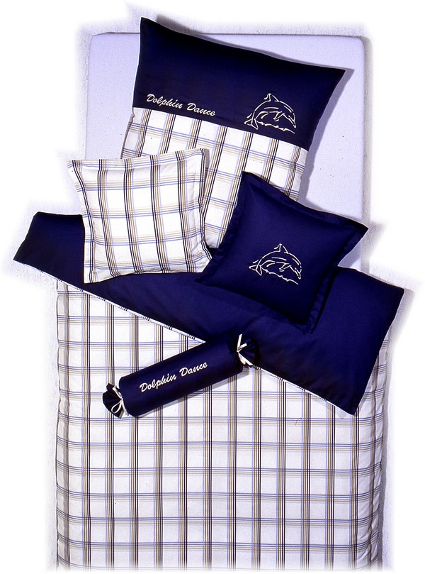 Bestehend aus Bettbezug 135x200 und Kissenbezug 80x80 sowie Stickerei "Delfin" auf großem Kissen ( ohne Zierkissen und Nackenrolle und ohne Namensstickere )