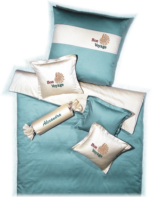 Bestehend aus Bettbezug 135x200 und Kissenbezug 80x80 incl. Stickerei "Bon Voyage" auf großem Kissen ( ohne Zierkissen und Nackenrolle )