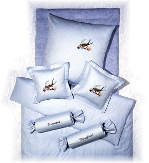 Bestehend aus Bettbezug 135x200 und Kissenbezug 80x80 sowie Stickerei "Delfin" auf großem Kissen ( ohne Zierkissen und Nackenrolle und ohne Namensstickere )