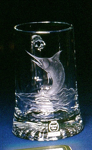 Wertvoller Bierkrug aus Kristallglas ohne Zinndeckel, Motiv handgraviert