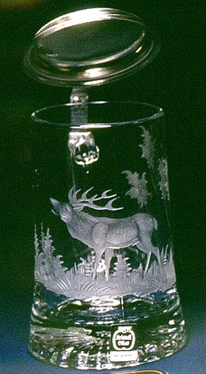 Wertvoller Bierkrug aus Kristallglas mit Zinndeckel, Motiv handgraviert